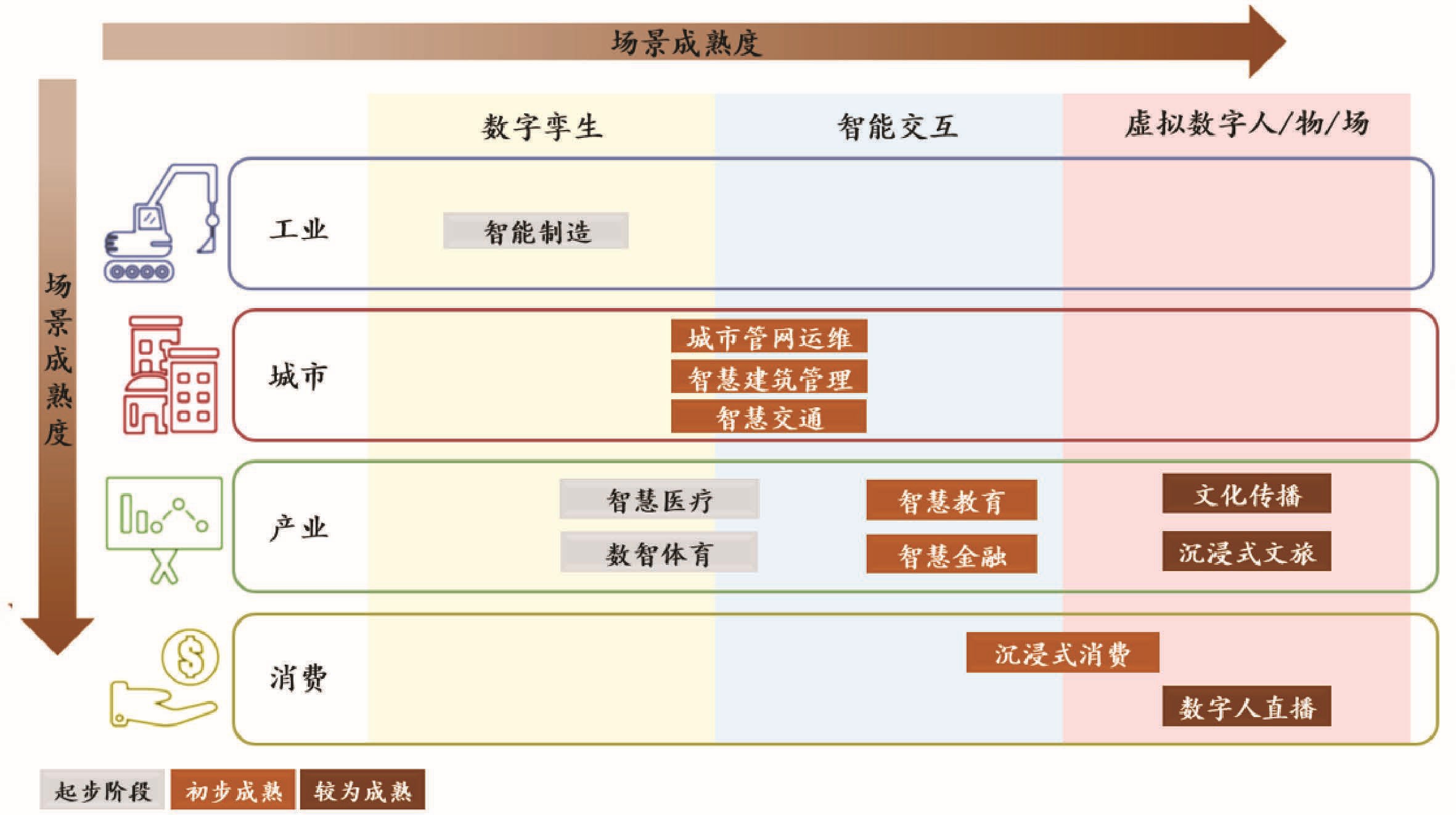 从技术维度看,互联网 3.0 场景多采用数字孪生、智能交互、虚拟数字人/物/场三类技术。其中,数字孪生技术强调实时计算,技术成熟度较低,智能制造、智慧医疗、数智体育等相关应用亦多处于起步阶段;智能交互技术目前相对成熟,城市管网运维、智慧建筑管理、智慧交通、智慧教育、智慧金融、沉浸式消费等相关应用已初步成熟;虚拟数字人/物/场等内容制作技术近年来迅猛发展,不断推陈出新,文化传播、沉浸式文旅、数字人直播等相关应用较为成熟。