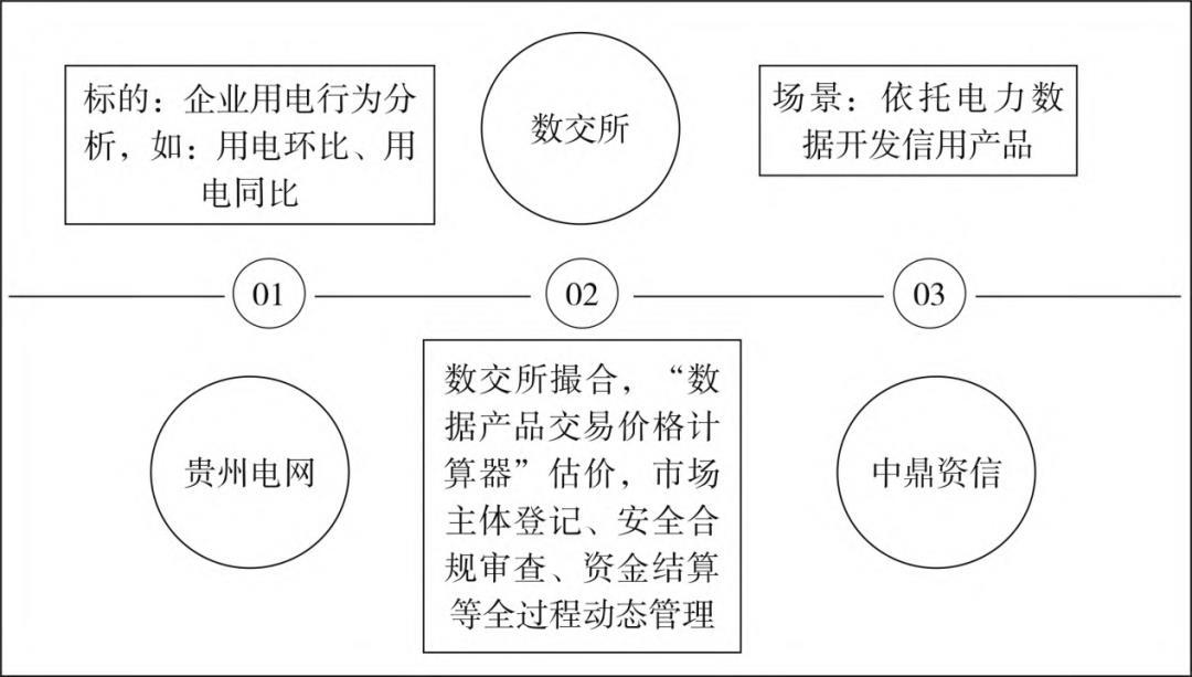 2. 典型案例。贵州电网与中鼎咨询的数据交易是电网数据产品估值定价的重要实践之一。2023年4月,经贵数所撮合,南方电网贵州电网公司与中鼎资信评级服务有限公司签订数据产品交易合同,标志着全国首笔基于“数据产品交易价格计算器”估价的场内交易完成。此次数据交易的签约,从市场主体登记到数据产品登记、安全合规审查、定价评估、资金结算、交易存证上链等环节全部通过贵数所完成,实现数据流通交易的全过程动态管理(见图2)。