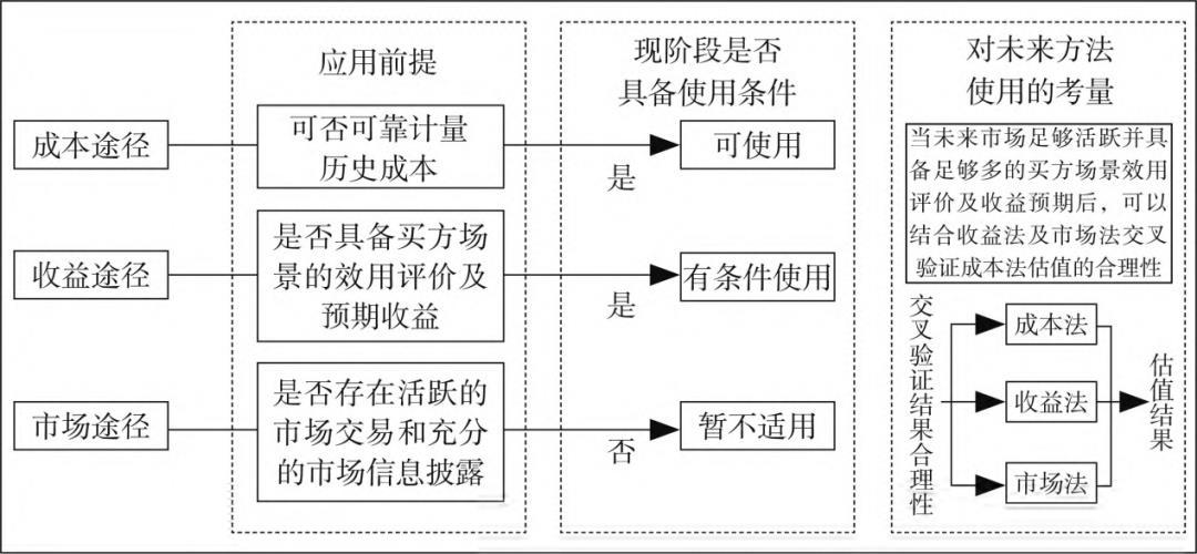 如图1所示,贵数所在研究及相应交易实践中发现,气象数据产品交易定价时,卖方更多是基于成本途径对自身的投入进行计算与调整,探索数据资产的开发价值及预期的场景价值。究其原因,在于缺乏买方应用数据产品的成效信息,卖方在定价时无法根据买方场景的效益/效用对数据资产进行综合评价,故较难采用收益法进行估值。整体看,近年来,在气象行业企业尚未健全数据资产管理及效益核算体系的情况下,成本途径优先具备应用条件,收益途径在一定条件下亦可使用(但成本途径和收益途径尚无法实现相互验证),市场途径暂不适用(普华永道和贵阳大数据交易所,2023)。