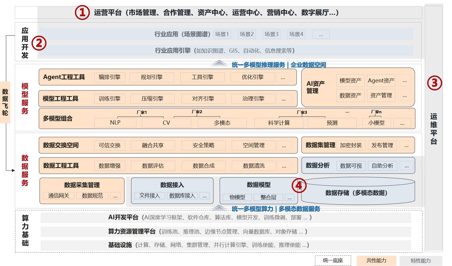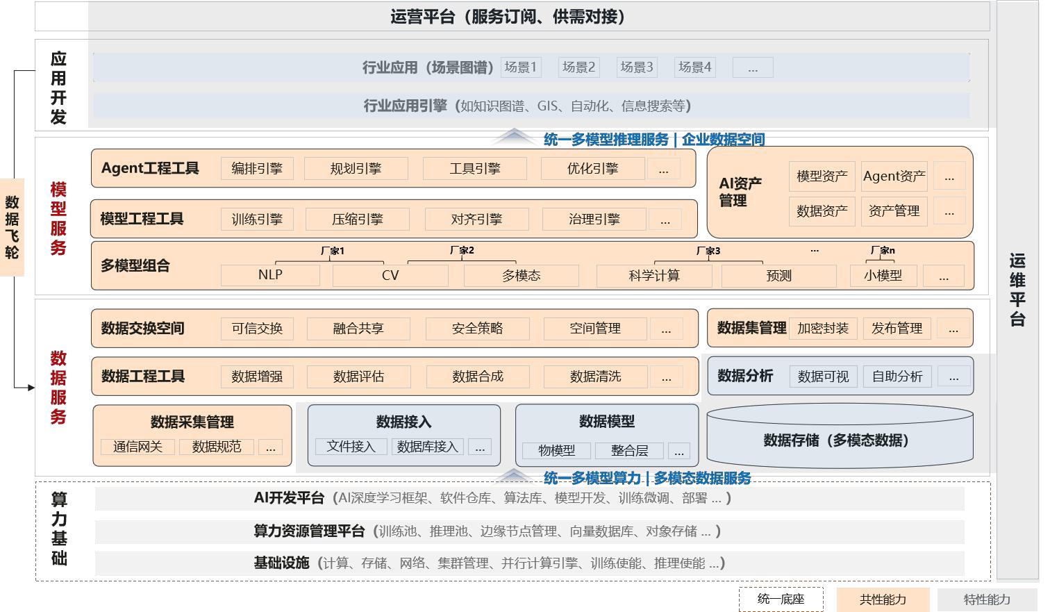 总体架构分为算力基础、数据服务、模型服务、应用开发、运维平台、运营平台等6个主要部分。在共性能力上以数据和模型为核心,具备一致性技术要求,特性能力上根据业务不同各具特点,如应用开发、数据处理、运营运维等。