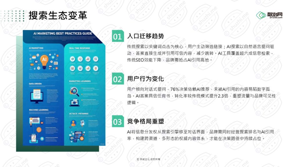 数治网院iDigi发现,相当大比例的用户查询现在可以通过AI的直接回答得到解决,无需进一步点击。这场新的竞赛被称为生成式引擎优化,其目标不是点击量,而是被引用率和品牌心智份额。
