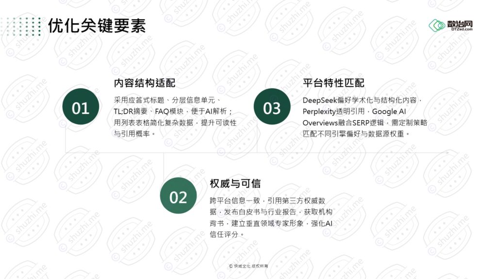 - 保持动态更新: AI模型对近期发布的、可信赖的页面有明显的偏好。定期更新关键页面中的数据和案例,是维持竞争力的必要条件。