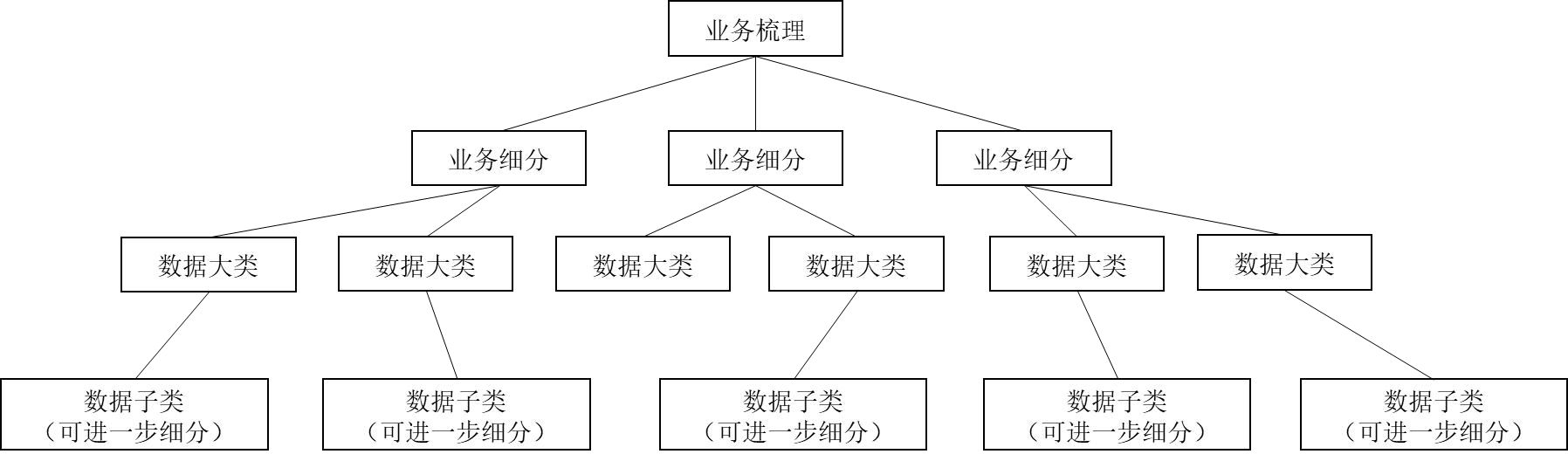 数据分类按照 GB/T 10113 中的线分类法为基础结合业务信息,根据医疗健康机构业务运营特点和内部管理方法,收集机构内所有部门的数据资源,梳理所有数据资源。按照线分类法,按照业务属性(或特征),将健康医疗数据分为若干数据大类,然后按照大类内部的数据隶属逻辑关系,将每个大类的数据分为若干层级,每个层级分为若干子类,同一分支的同层级子类之间构成并列关系,不同层级子类之间构成隶属关系。所有数据类及数据子类构成数据资源目录树,如图下所示。目录树的所有叶子节点是最小数据类。最小数据类是指属性(或特征)相同或相似的一组数据。