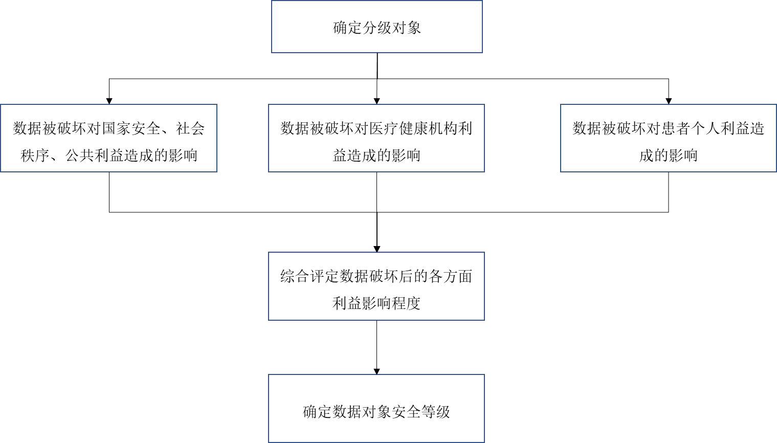 在数据分类基础上,根据健康医疗数据重要程度以及泄露后对国家安全、社会秩序、医疗机构经营管理和公众利益造成的影响和危害程度,对健康医疗数据资源进行分级。数据分级的步骤和方法宜采用下图: