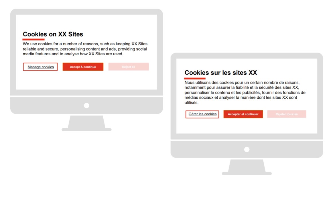 • 颜色:可以根据组织的形象与风格,设计同意横幅的颜色。在字体颜色方面,尝试视觉冲击强的颜色搭配(例如深色背景和亮色文本,而不是亮色背景和深色文本),可能会提高同意率。例如,“拒绝”按钮使用浅色,“接受”按钮使用较深的颜色,有边框,且有一个易于选择的图标。