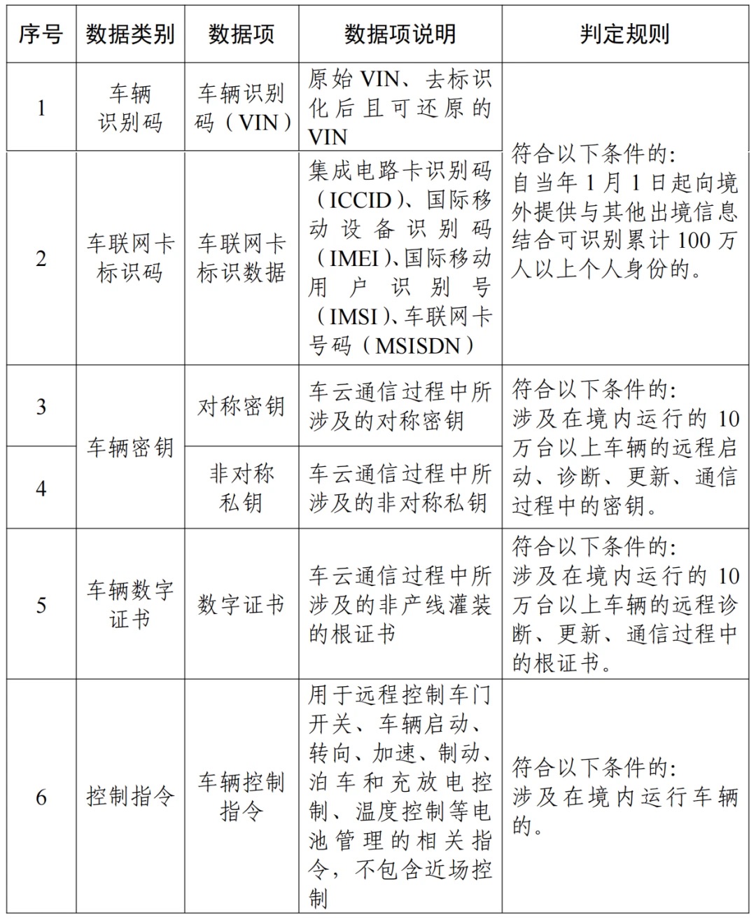- 车辆与平台数据:车辆识别码(VIN)、车联网卡标识码等,如果与其他信息结合能识别超百万人的身份,则触发管理要求。涉及10万台以上车辆的远程通信密钥和根证书,也被划入重要数据范畴。车联网平台的网络拓扑图若包含敏感区域信息,充电数据若累计出境超百万人次,都需纳入管理。