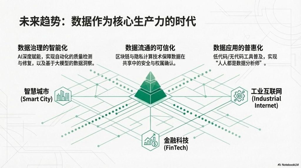 - 全域:必须打破部门、系统间的壁垒,实现财务、销售、生产等跨领域数据的融合。例如,智慧交通需要融合路况、气象、车辆数据,才能做出有效调度。