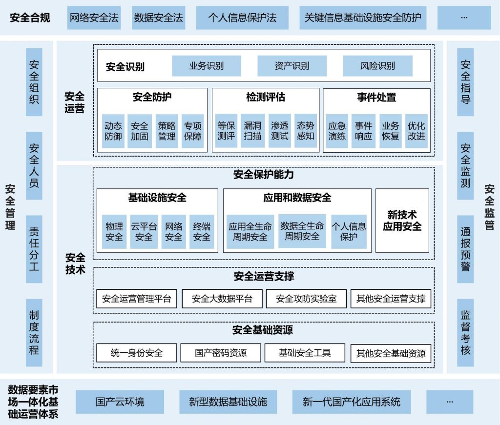 • 合规层:以“三法一条例”等法规为基础,重点保护关键信息基础设施